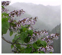 桐≠フ花である。ほのかに漂う優雅な匂いをかぐのは初めてだ。花札で見たのとは違うねと思っているのは誰!山の中腹にいくつか咲いているの紫の花は藤だとばかり思っていた。よく見ると下に垂れ下がって咲いているのは藤で、上に向かって勢いよく咲いているのが桐なのだそうだ。