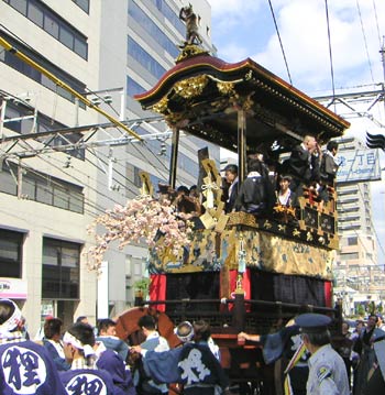 俗に「狸山」といい、塩売冶兵衛の狸面の伝承をもつが、明暦2年に西行法師が桜の精(仙人)と問答を交わす態を現した人形を用いるようになって、その名を西行桜と改めた。 ・ 2003年新調:水引幕 「唐子嬉遊図」 |